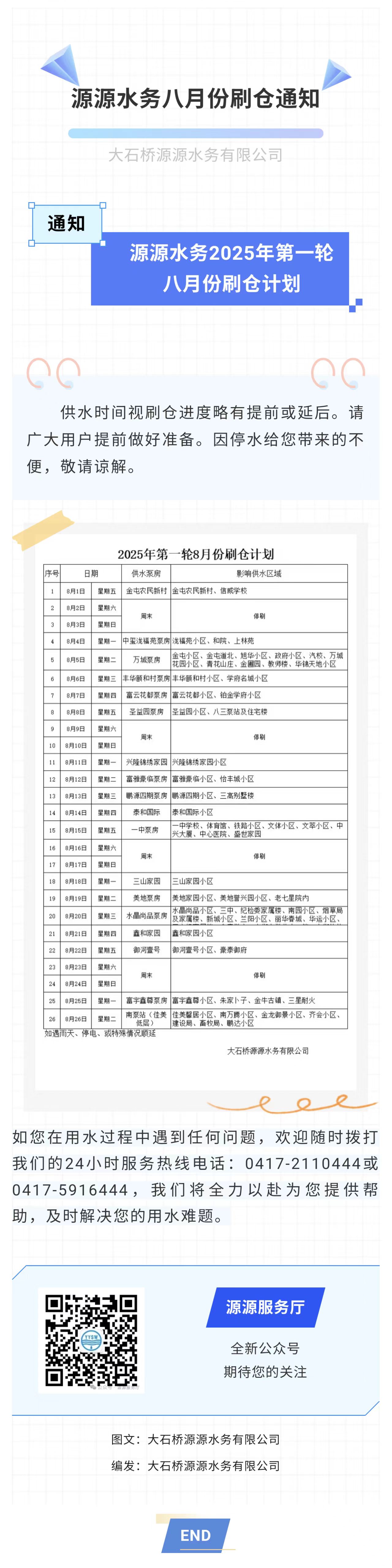 公司新聞 您當(dāng)前的位置: 大石橋源源水務(wù)有限公司 >資訊動(dòng)態(tài) >公司新聞 源源水務(wù)八月份刷倉(cāng)通知 作者: 2021-03-30 下一篇:關(guān)于冬季防寒防凍的溫馨提示 下一篇:源源水務(wù)九月份刷倉(cāng)通知 返回